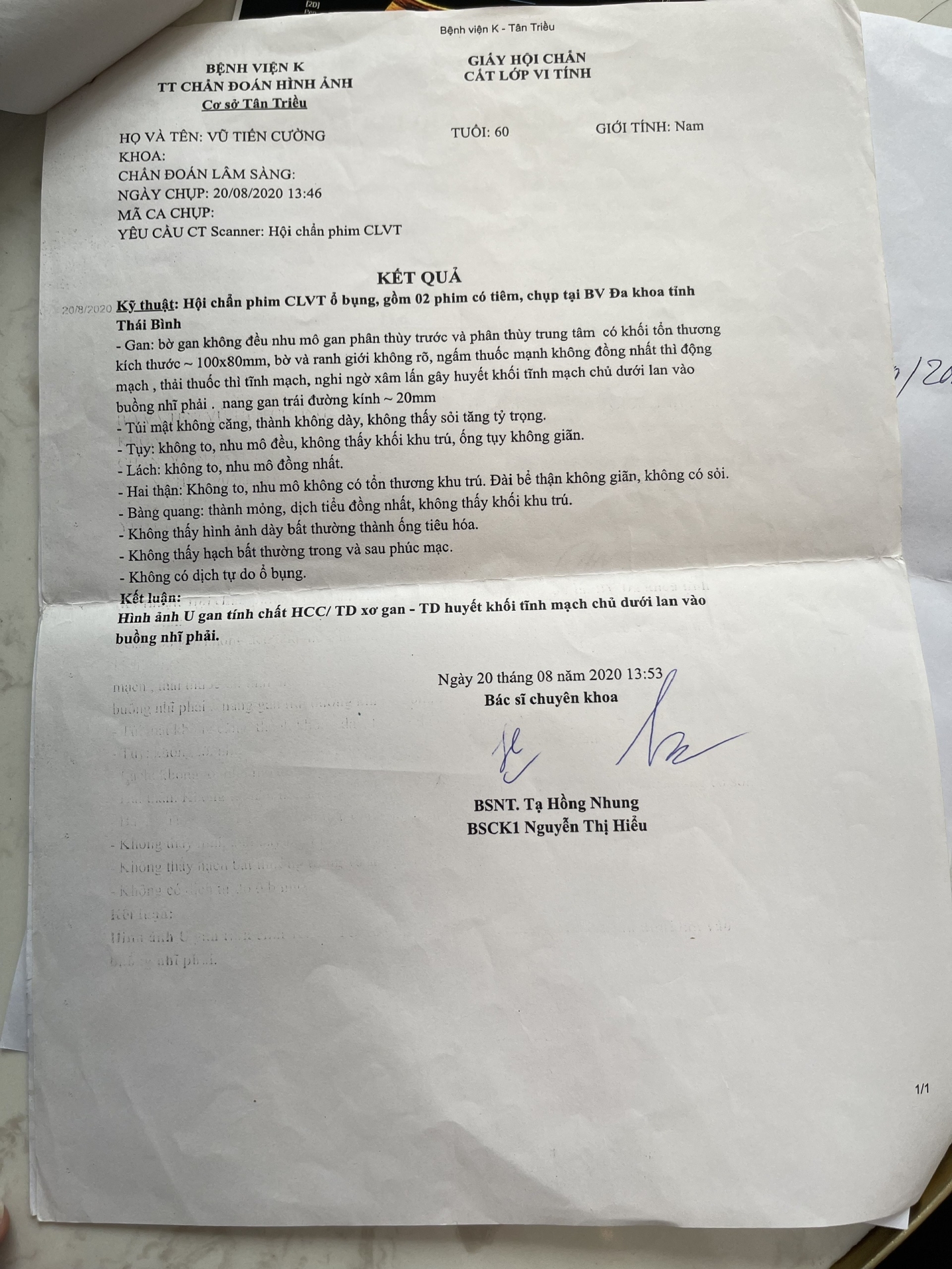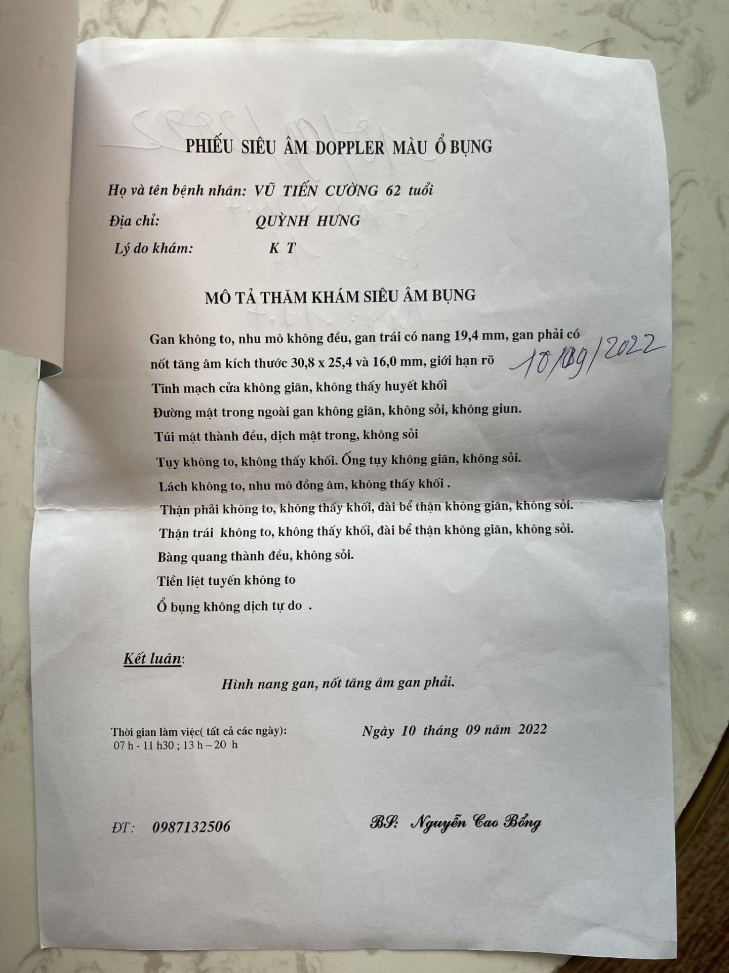 Bác Vũ Tiến Cường - 63 tuổi, hiện ở tại Quỳnh Côi, Quỳnh Phụ, Thái Bình. Trong 1 lần đột nhiên có cơn đau quặn bụng, bác đi khám thì phát hiện có khối u gan rất to, kích thước 80x100mm tương đương 1 chiếc bát ăn cơm. Bác và gia đình vô cùng bàng hoàng, bệnh viện đã cho bác về, không chữa trị nữa vì không còn nhiều hy vọng.
