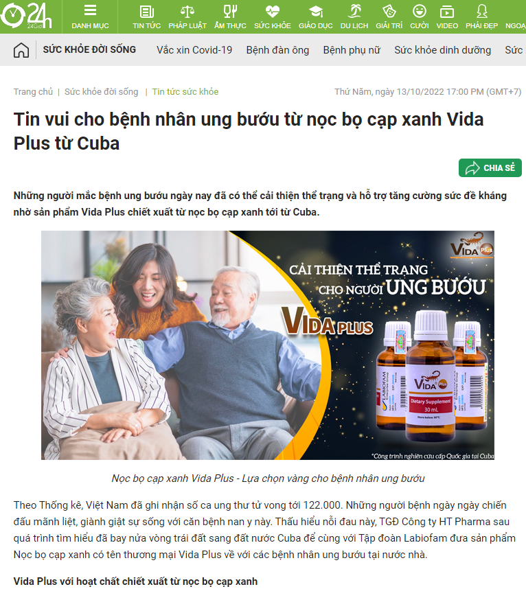 Báo 24h : Tin vui cho bệnh nhân ung bướu từ nọc bọ cạp xanh Vida Plus từ Cuba