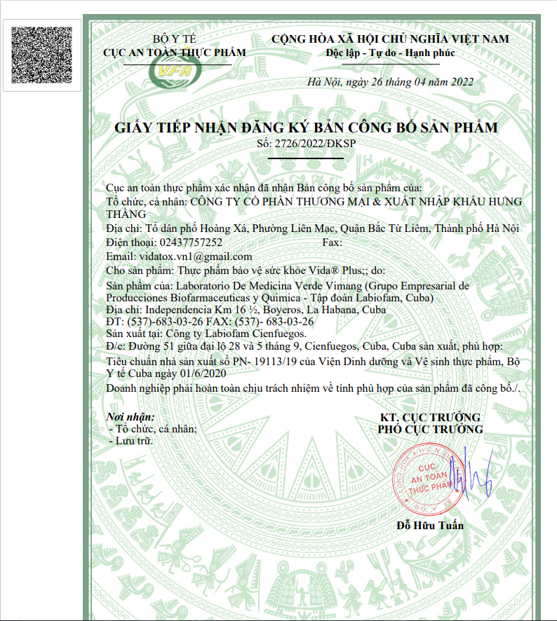TPBVSK Nọc bọ cạp xanh Vida Plus được cấp phép và lưu hành dưới sự quản lý của nhà nước thông qua giấy phép nhập khẩu, giấy chứng nhận An toàn thực phẩm, giấy phép quảng cáo của Bộ Y Tế.