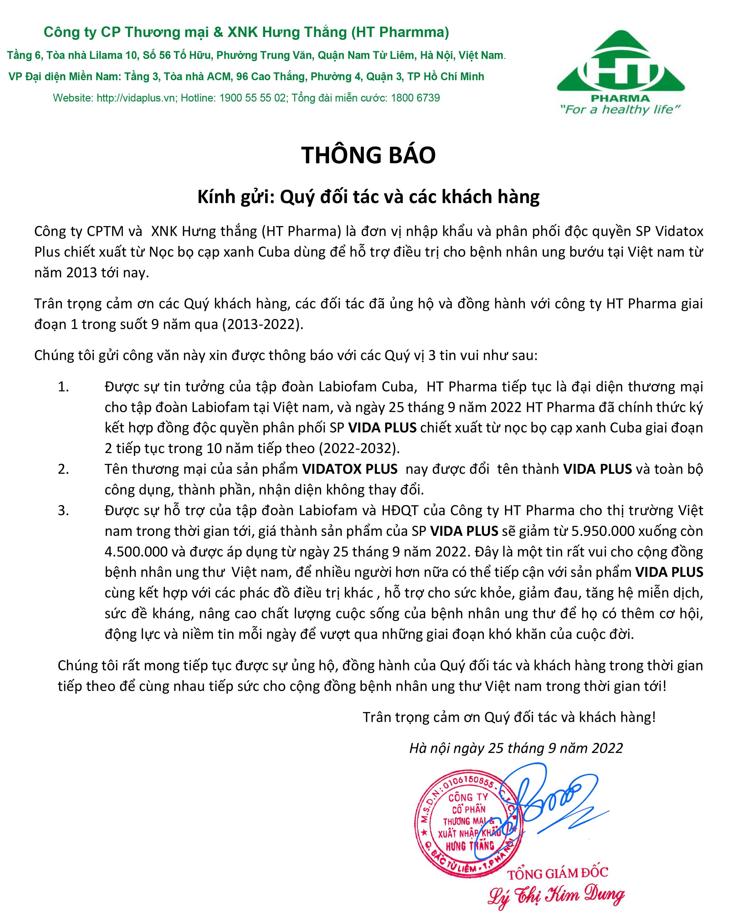 - Được sự hỗ trợ của tập đoàn Labiofam và HĐQT của Công ty HT Pharma cho thị trường Việt Nam trong thời gian tới, giá thành sản phẩm Vida Plus sẽ giảm từ 5.950.000 xuống còn 4.500.000 và được áp dụng từ ngày 25/9/2022. Đây là một tin rất vui cho cộng đồng bệnh nhân ung thư Việt Nam, để nhiều người hơn nữa có thể tiếp cận sản phẩm VIDA PLUS cùng kết hợp với các phác đồ điều trị khác, hỗ trợ cho sức khoẻ, giảm đau, tăng cường hệ miễn dịch, sức đề kháng, nâng cao chất lượng cuộc sống của bệnh nhân ung thư để họ có thêm cơ hội, động lực và niềm tin mỗi ngày để vượt qua những giai đoạn khó khăn của cuộc đời