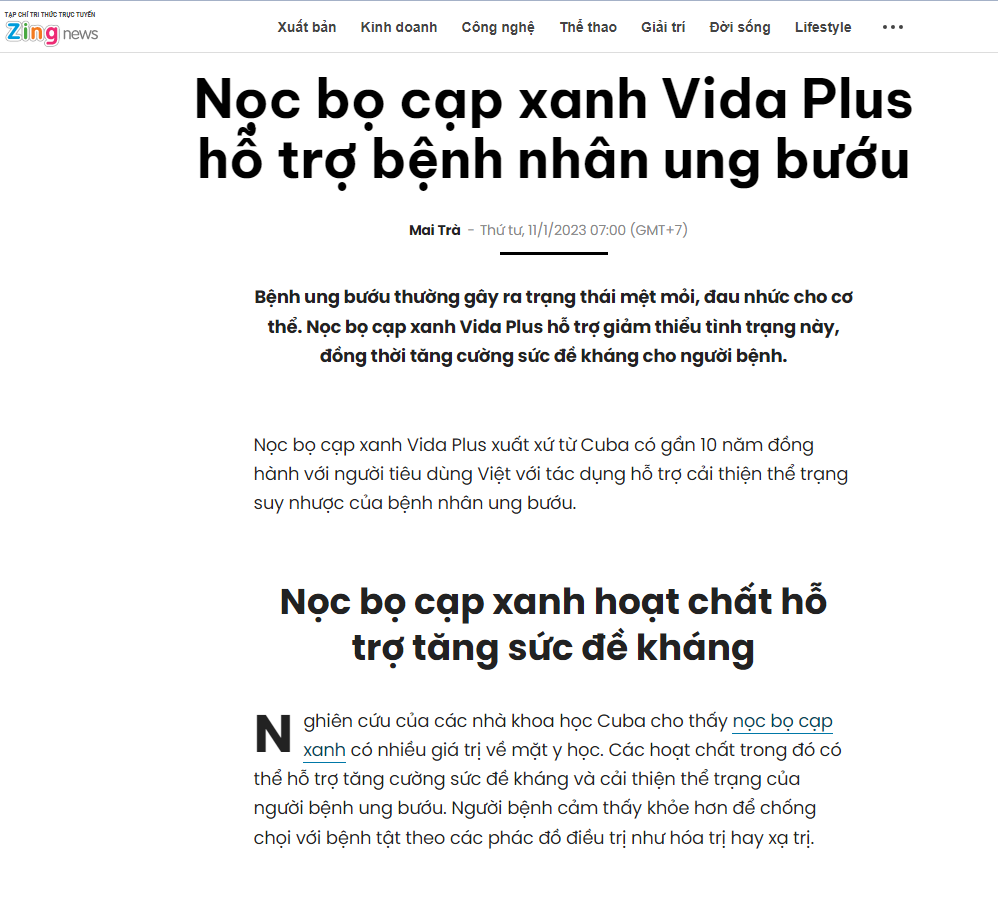 Nguồn : Báo Zingnews - Tạp chí điện tử Tri Thức trực tuyến https:// zingnews. vn/noc-bo-cap-xanh-vida-plus-ho-tro-benh-nhan-ung-buou-post1392660.html