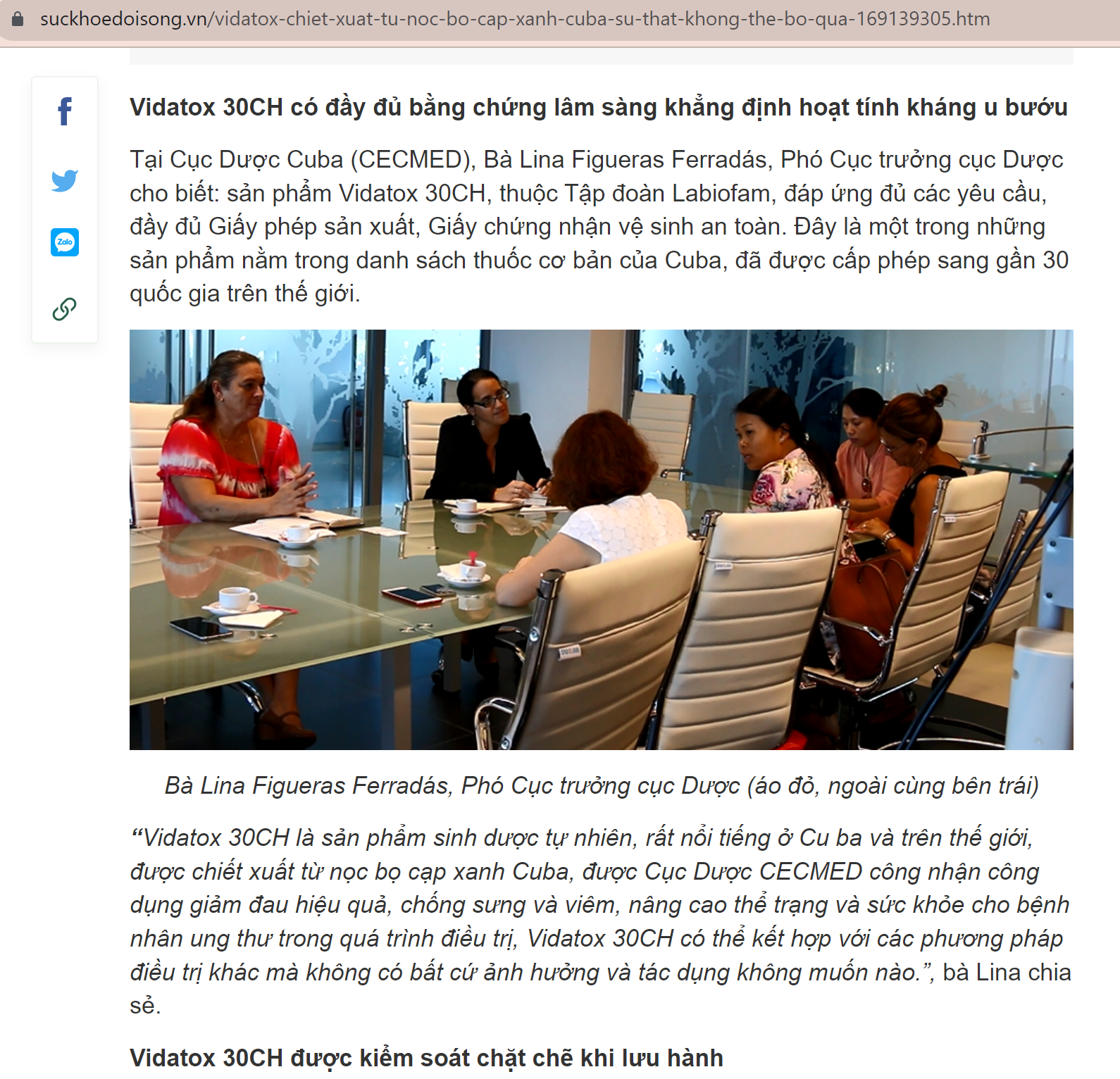 Tại Cục Dược Cuba (CECMED), Bà Lina Figueras Ferradás, Phó Cục trưởng cục Dược cho biết: sản phẩm Vidatox 30CH, thuộc Tập đoàn Labiofam, đáp ứng đủ các yêu cầu, đầy đủ Giấy phép sản xuất, Giấy chứng nhận vệ sinh an toàn. Đây là một trong những sản phẩm nằm trong danh sách thuốc cơ bản của Cuba, đã được cấp phép sang gần 30 quốc gia trên thế giới.